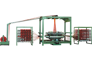 圓織機的經(jīng)紗架上有許多紗錠,依據(jù)編織布幅寬和扁絲寬度,使用規(guī)定范圍數(shù)量的經(jīng)紗.經(jīng)紗進入圓織機前,由經(jīng)紗的棕框?qū)?jīng)紗進行交叉開口,緯紗梭子在交叉開口中作圓周運動穿過經(jīng)紗,編織成筒布.
